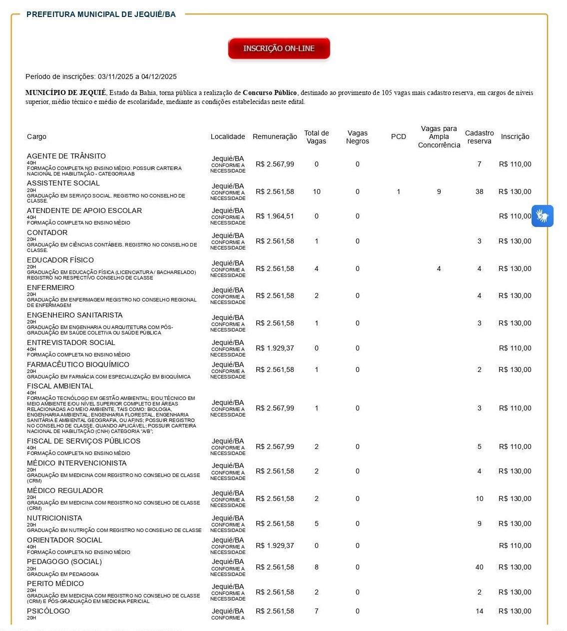 O tão aguardado concurso público do município de Jequié foi oficialmente publicado, trazendo 625 oportunidades entre vagas para início imediato e formação de cadastro reserva. Dividido em três editais, o certame contempla cargos de níveis médio e superior em diversas áreas do serviço público municipal.