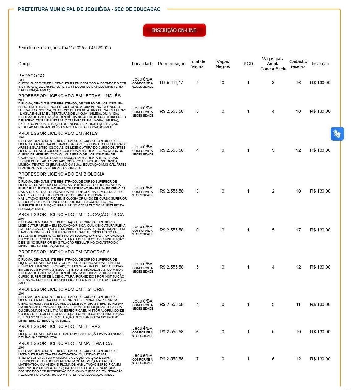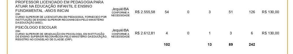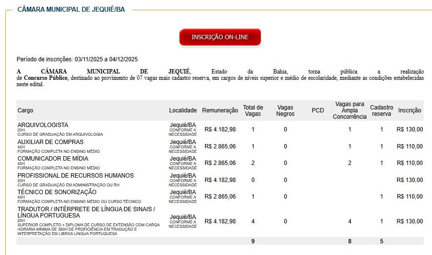Já o edital nº 003/2025, referente à Câmara Municipal de Jequié, oferece 9 vagas imediatas e 5 para cadastro reserva, totalizando 14 vagas.